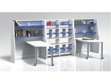 • Le poste de travail Minilab avec panneau d’intimité répond à la nécessité de créer un coin de travail bien identifié et séparé, déjà équipé d’une table et d’étagères.